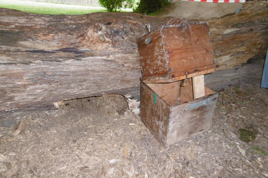 Ein großer alter Baumstamm auf einem Kindergartengelände war nicht nur für die Kinder interessant, sondern auch ein Hummelvolk hatte sich im schon sehr morschen Teilbereich eingenistet. Nachdem Kinder gestochen worden sind, ging es darum, eine gute Lösung auch für die Hummeln zu finden. Der Bereich wurde erst mal abgesperrt und ich wurde gebeten mich darum zu kümmern. Vorort schaute ich mir den Neststandort an und kam zur Überzeugung, dass eine Umsiedlung möglich ist. Am Abend stellte ich einen Umsiedlungskasten neben den Nestbereich und mit Schutzanzug und Handschuhen legte ich das freigelegte Nest mit ein paar Hummeln in den Kasten. Nicht gerade erfreut waren die Hummeln