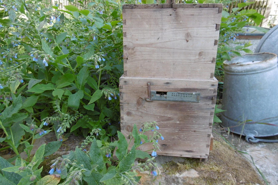 Den Kasten mit den Hummeln stellte ich bei uns im Garten zwischen Beinwell Pflanzen und öffnete am nächsten Morgen sehr früh das Flugloch.