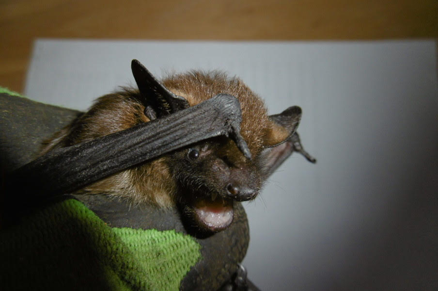 Seit gut 14 Tagen habe ich eine Zwergfledermaus zur Pflege. Sie hatte sich ein Rolltor als Schlafplatz ausgesucht und wurde nach dem Öffnen verletzt aufgefunden. Leider hat sie einen Flügelbruch und wird nie wieder fliegen können.
