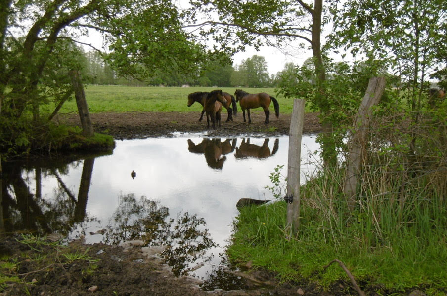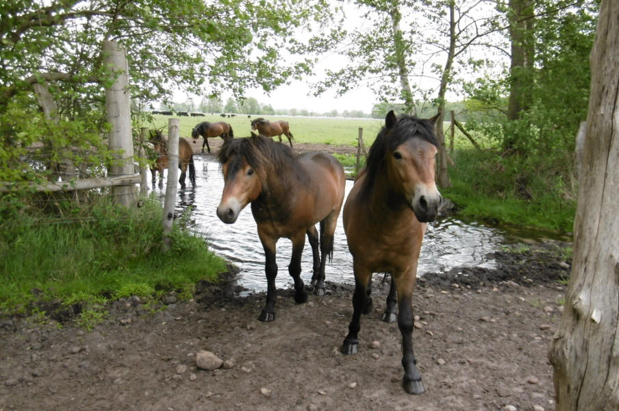 Neben Exmoor Ponys beweiden noch 30 Bullen und Wasserbüffel die unterschiedlichen Flächen im Naturschutzgebiet. Die Tiere leben das ganze Jahr draußen und sind im Allgemeinen sehr scheu.