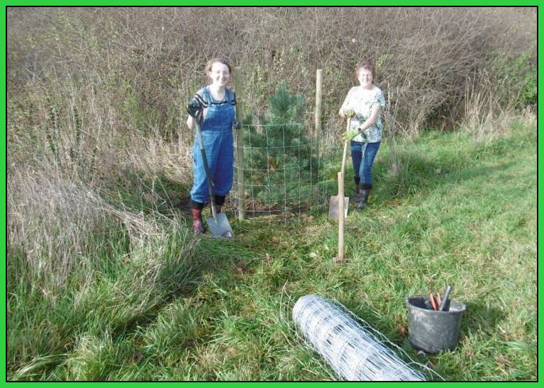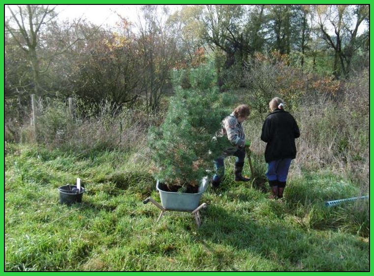 Neben weiteren kleinen Pflege-Aktionen im Schutzgebiet wurde noch ein Jahresbaum ersetzt. Etwas mühsam war die lange Anfahrt mit der Schubkarre, um den Pflanzort zu erreichen. Isabell und Sabine begannen dann beherzt mit dem Ausheben einer Pflanzgrube.