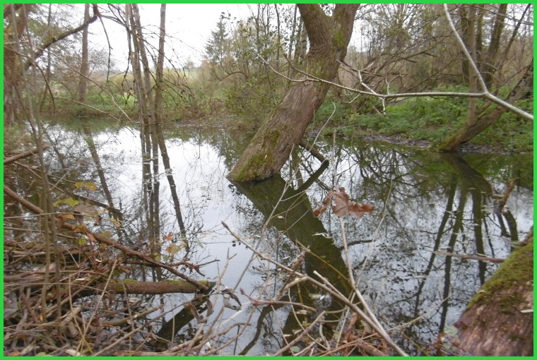 Der Staueffekt hat das Gewässer sehr verändert mit Überflutung angrenzenden Wiesen wovon der Bewirtschafter nicht gerade erfreut ist. Mal sehen ob sich der Biber hier dauerhaft halten kann und wann er im Schutzgebiet seine ersten Spuren hinterlässt.
